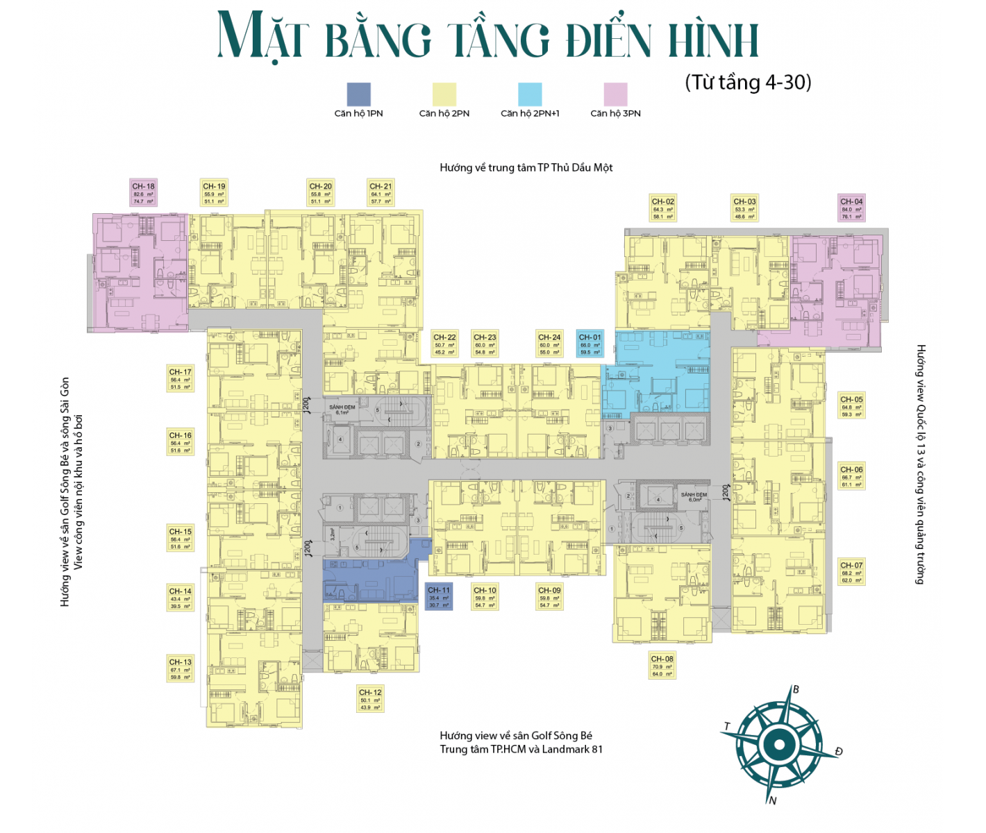 Mặt bằng Diamond Boulevard tầng điển hình từ T4-30, mỗi tầng có 24 căn, 9 tháng máy. Thiết kế mặt bằng dự án Diamond Boulevard Thuận An có tỷ lệ vàng, cho phép các căn hộ tập trung ở diện tích vừa phải trong khoảng 50 – 67m2. Tạo điều kiện cho khách hàng có nhiều cơ hội tiếp cận đến dự án hơn. Diện tích căn góc 3PN là những căn “hoàng hậu” hiếm có nhất, dành riêng cho những khách hàng thượng lưu.