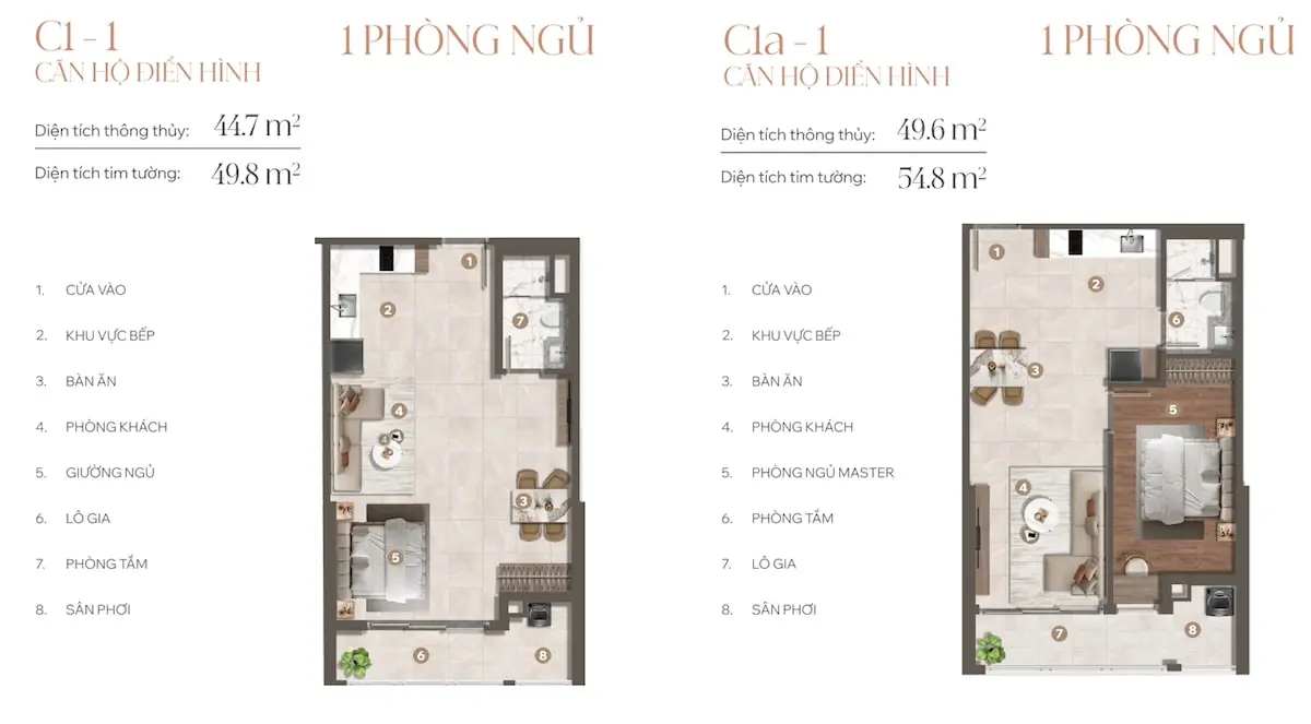 | 1 Phòng ngủ | 49m² | Giá từ 6.500 – 7.150 tỷ |